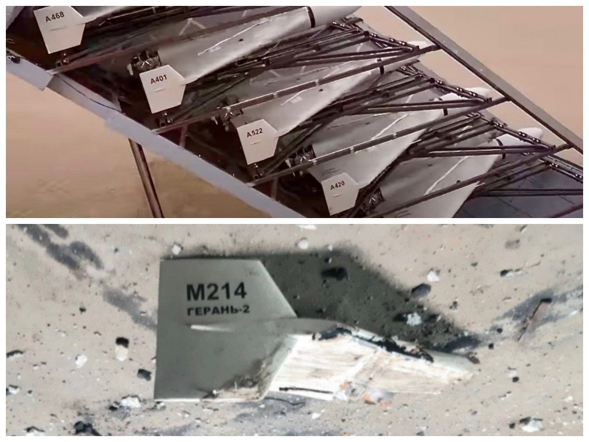 IRNA/Siły Zbrojne Ukrainy" alt="Na górnym zdjęciu irańska amunicja krążąca Shahed-136 na wyrzutni, na dolnym szczątki "rosyjskiej" amunicji Gerań-2"/>